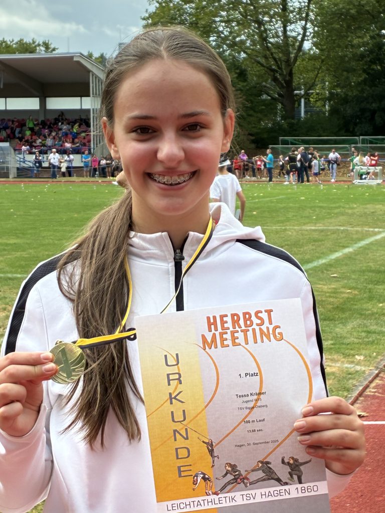 1,90m waren das angesagte Ziel für Hochspringer Leander Vorderwülbecke, was er in Hagen noch nicht ganz erreichte. Mit 1,80m blieb ihm der Sieg in der Männerklasse. Sehr souverän war der Auftritt von Tessa Krämer über 100m der W15. Tessa siegte in einem großen Teilnehmerfeld in 13,68 sec. Für den Sieg wurde auch sie mit einer Goldmedaille ausgezeichnet.