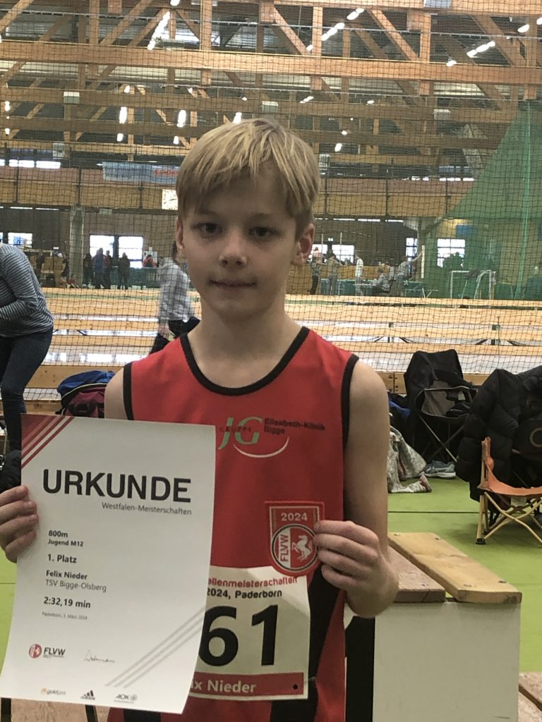 Bei den U-14 Westfalenmeisterschaften in Recklinghausen ging Felix als einziger TSV-Athlet an den Start. In der Altersklasse M13 war die Konkurrenz mit der maximalen Teilnehmerzahl von 24 Läufern groß. Mit der fünft schnellsten Meldezeit gemeldet, startete Felix im ersten von zwei Zeitläufen gemeinsam mit den favorisierten Läufern. Das Meisterschaftsrennen machte seinem Namen aber alle Ehre und startete mit sehr langsamen ersten 400m. Pünktlich zur zweiten und letzten Stadionrunde zog das Tempo ordentlich an. Felix, zu dem Zeitpunkt auf Platz 6 liegend, verpasste es leider bei der ersten Gruppe mitzugehen, konnte aber mit gewohnten schnellen letzten Metern seinen 5. Platz aus der Meldeliste behaupten. Seine Endzeit von 2:28,91 bedeutet trotz der langsamen ersten Runde die zweitschnellste Zeit seiner noch jungen Karriere und bestätigt Felix Aufwärtstrend.